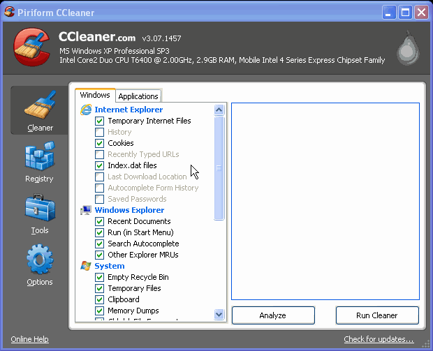 The cleaner tab allows you to choose the options on which you wish to perform automatic cleaning operations. The windows tab under the Cleaner tab lists all of the built-in softwares and tools in the Windows. While Applications tab allows you to select options for third party tools or softwares like Google Chrome, Mozilla Firefox, etc.